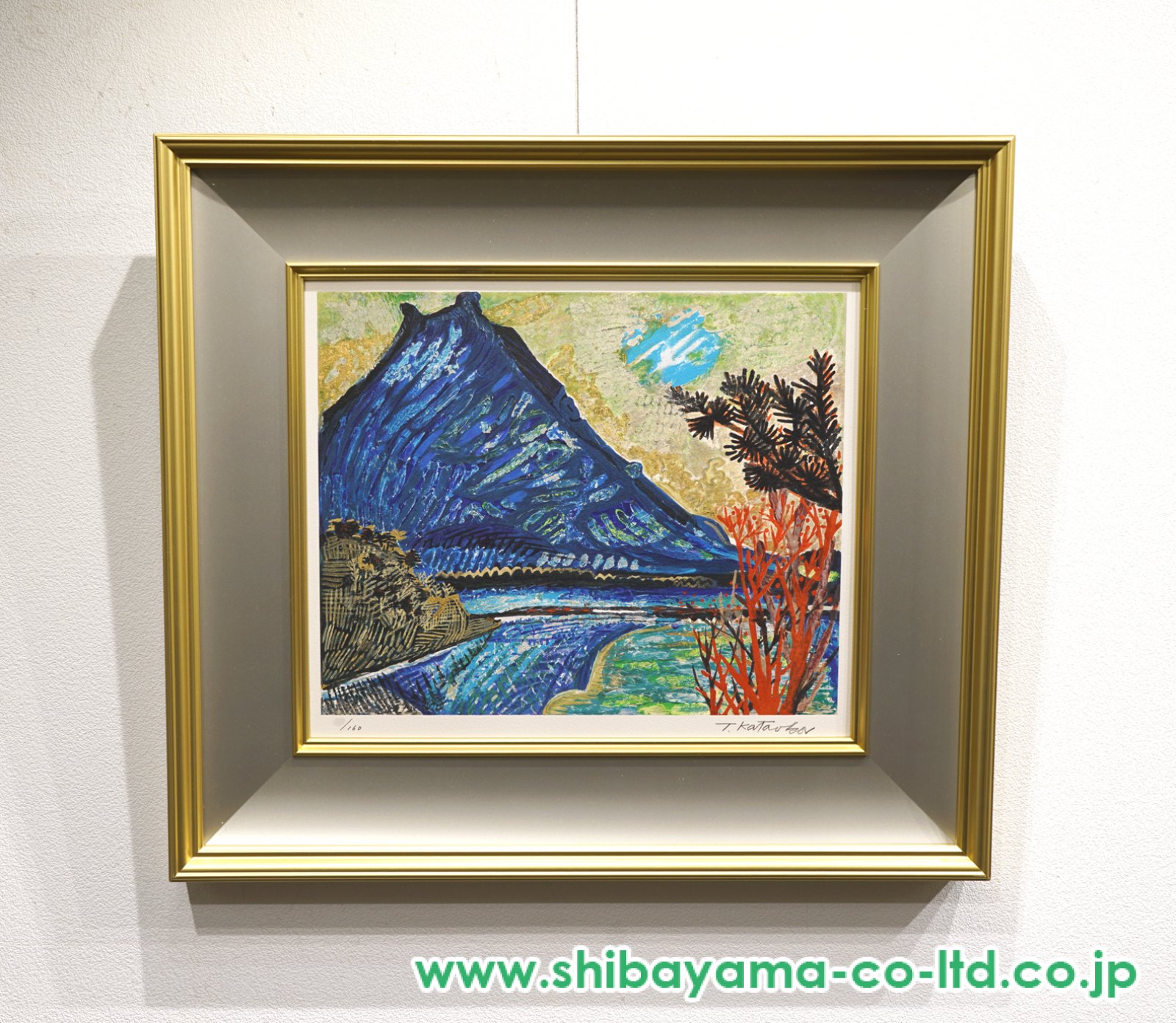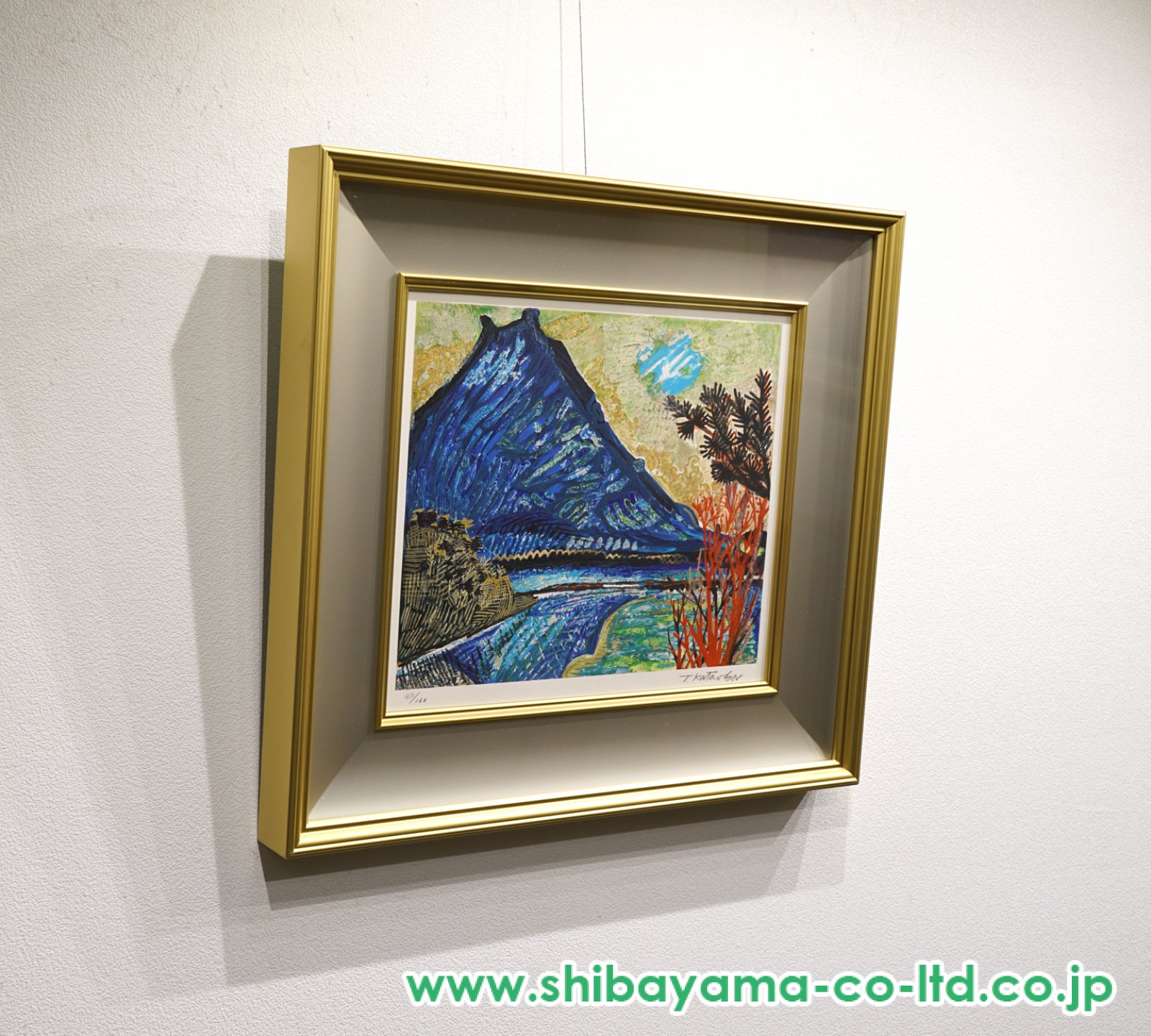 女子美術大学創立100周年記念として制作された版画作品で、原画は女子美術大学美術館に収蔵されています。片岡球子は同大学ゆかりの画家として知られ、荒々しい線と鮮烈な色彩で自然の生命力を表現する独自の画風を確立しました。本作でも、大胆に単純化された山容と渦巻くような水面表現が画面に強い律動を与え、青を基調とした色彩の重なりが奥行きを生み出しています。前景の赤い樹木や黒松のシルエットは祝祭的なアクセントとなり、自然への畏敬と高揚感を同時に伝えます。