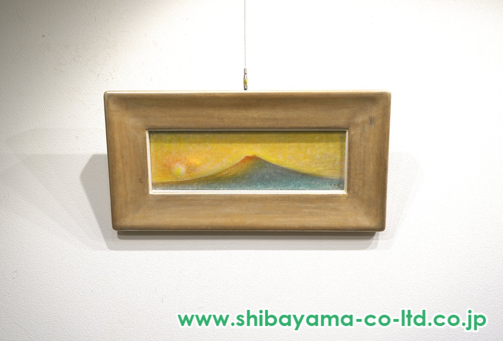 牛島憲之《初富士》は、新年のはじまりに仰ぐ富士の姿を、極度に簡潔化された造形と澄んだ色調によって描いた作品です。横長の画面に配された富士は、細部を排しながらも、なだらかな稜線と頂の気配によって確かな存在感を放ちます。画面を満たす柔らかな金色と淡い青緑の移ろいは、初日の光が大気に溶け込む瞬間を思わせ、静かな祝祭性を感じさせます。 牛島憲之は、戦後日本洋画において抒情的抽象と具象の境界を探求した画家であり、富士山も生涯にわたり重要な主題の一つでした。本作では、自然の形象を借りながらも、見る者の内面に広がる「始まりの感覚」や時間の余白を描き出しています。静謐でありながら希望を湛えた《初富士》は、牛島芸術の到達点を静かに物語る一作です。
