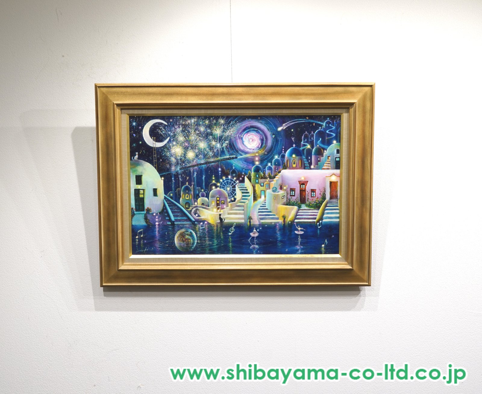 光と影が織り成す都市の情景を油彩ならではの鮮やかな色彩で描いた作品です。作品タイトルが示すように、ただの街並みではなく、光が夢のように溶け込み、街そのものが幻想的な空気を帯びている点が魅力。晴れた日の強い光と、それが生み出す影とのコントラストがリズミカルに組み合わさり、画面全体に躍動感と静謐さを同時に感じさせます。大根田真は、都市と自然、日常と非日常という二つの対極をひとつの画面に同居させる表現で評価される画家で、光や色彩を通して観る者の記憶や感情を呼び起こす作品を多く手がけています。本作《光と夢の街》は、街の細部を忠実に描写するだけでなく、色彩の重なりと光の挙動によって、鑑賞者それぞれが思い描く“夢の情景”を投影できる余地を残しています。日常の中に非日常の瞬間を感じさせる一枚として、インテリアに彩りを添えるだけでなく、日々の気持ちを軽やかにしてくれる作品です。