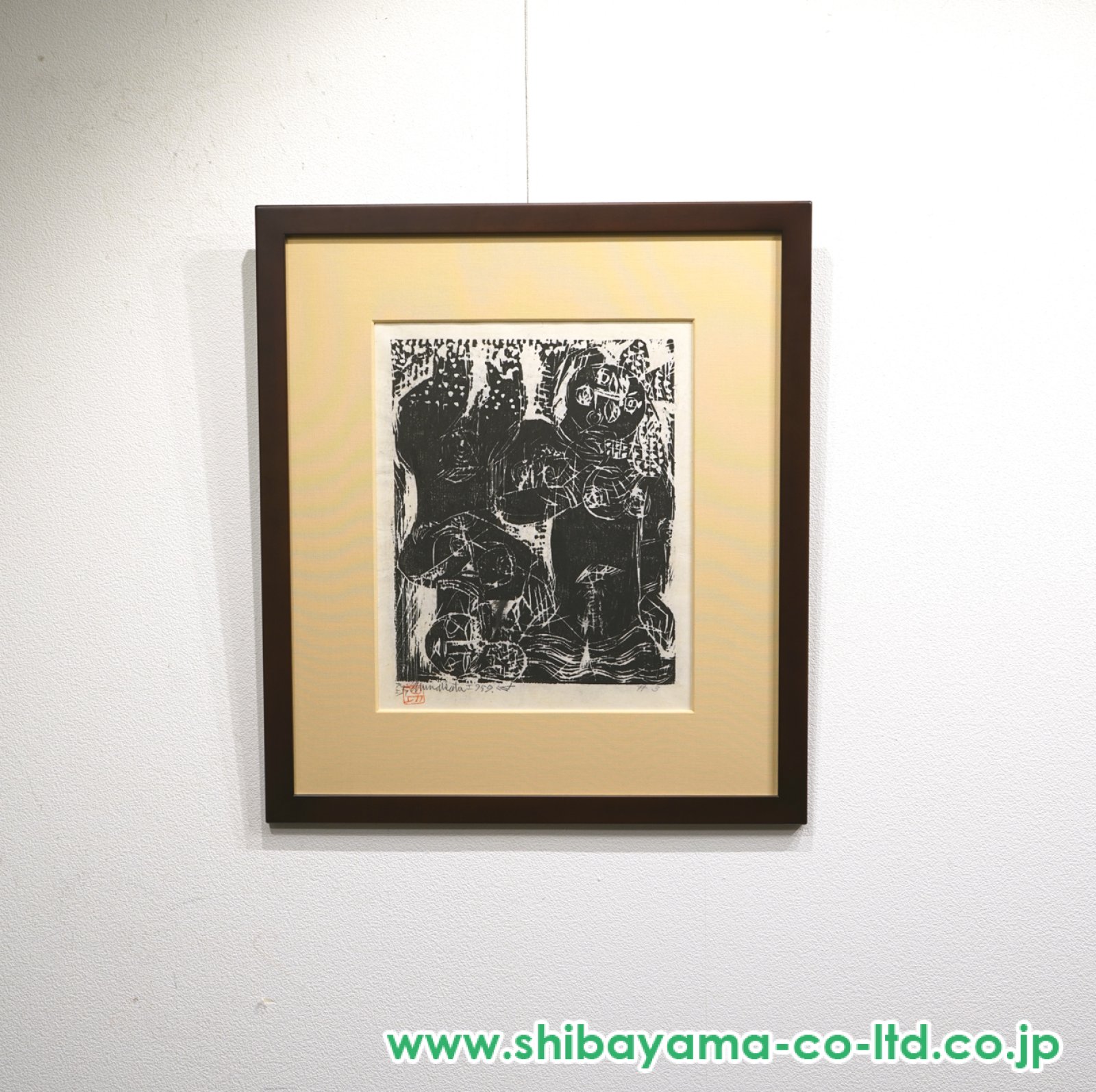 棟方志功が生涯追い求めた精神性と生命力が凝縮された板画(木版画)作品です。題名にある「宙舞」は、地上の理を超えて舞う存在を示唆し、「双妃」は二人の女性的な神性、あるいは霊的存在を象徴しています。「柵(さく)」とは複数図から成る連作・組作品を意味し、本作も複数の画面によって一つの物語的・象徴的世界を構成しています。 棟方は自らの版画を「板画」と呼び、下絵に頼らず、木と直接向き合いながら彫り進めることで、素材そのものの力と人間の魂が交感する瞬間を重視しました。本作においても、力強く奔放な線、誇張された人体表現、余白を恐れない大胆な構成が画面に躍動感を与えています。人物は写実を超え、まるで祈りや祝祭の中で宙を舞う存在のように描かれ、観る者に原始的なエネルギーと高揚感を伝えます。 「宙舞双妃の柵」は、民俗的・宗教的イメージと棟方独自の直観的表現が結びついた作品であり、人間の根源的な生命力や精神の解放を象徴的に表した一作といえるでしょう。棟方志功の芸術理念である「美は我に在らず、板に在り」という思想が、鮮烈に体現されています。