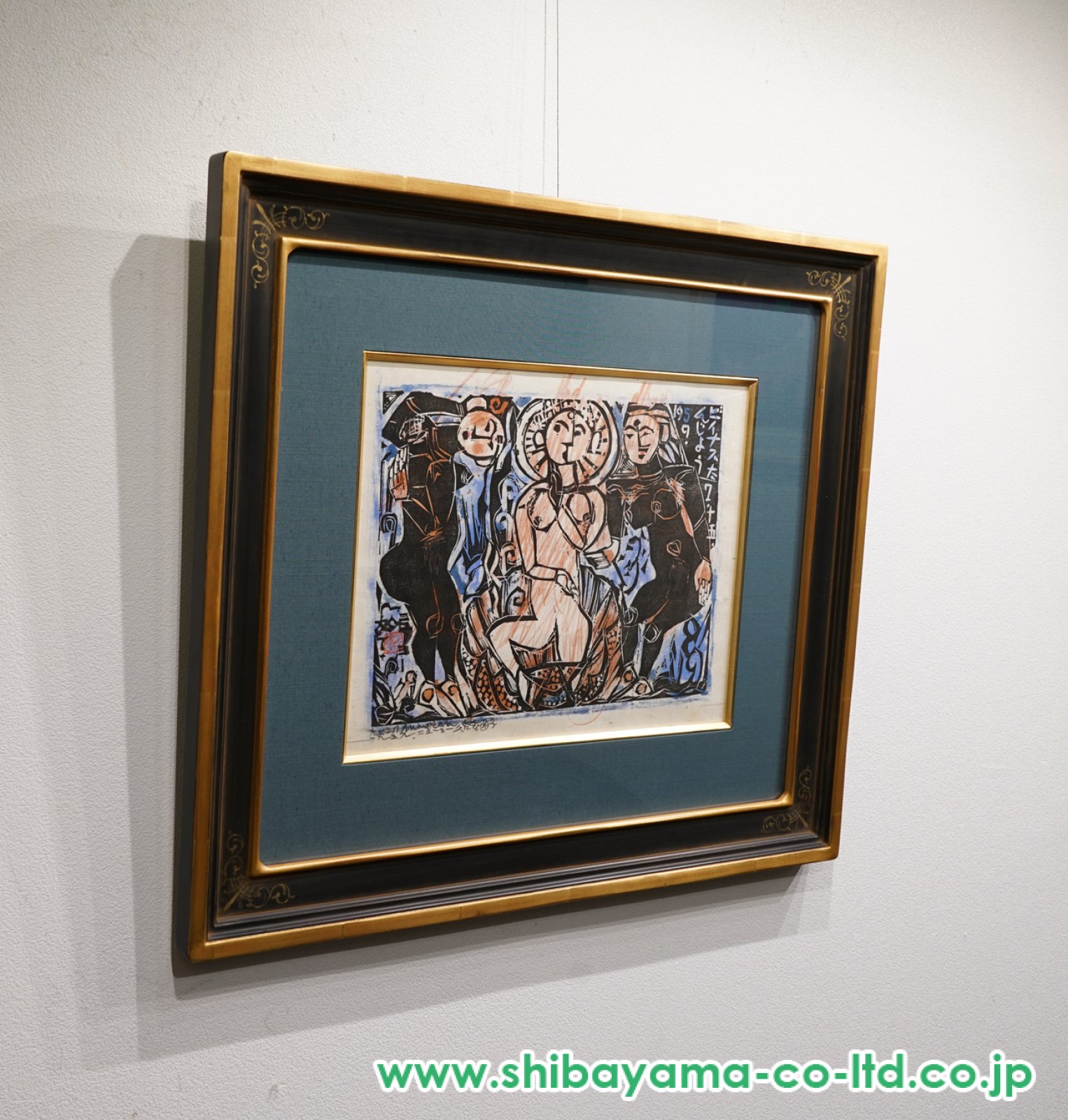 棟方志功が生涯追求した“生命の歓喜”と宗教的精神性が凝縮された板画作品です。棟方は青森に生まれ、独学で木版表現を切り拓いた作家として知られ、力強い彫り跡と即興的な線、文字や記号を交えた独自の画面構成で国際的評価を確立しました。本作では中央に配された裸身の女神像を核に、左右に人物像が配され、黒い輪郭線と鮮烈な青・朱の色彩が画面に激しいリズムを与えています。荒々しくも慈愛に満ちた造形は、人間存在の根源や誕生の神秘を象徴的に表現しており、宗教画と民俗的感覚が融合した棟方芸術の真骨頂といえる一作です。彫りの勢いそのものが祈りとなり、観る者に強い生命感を伝えます。