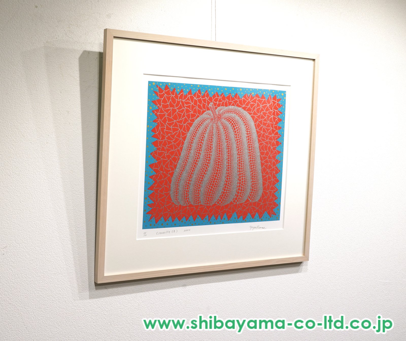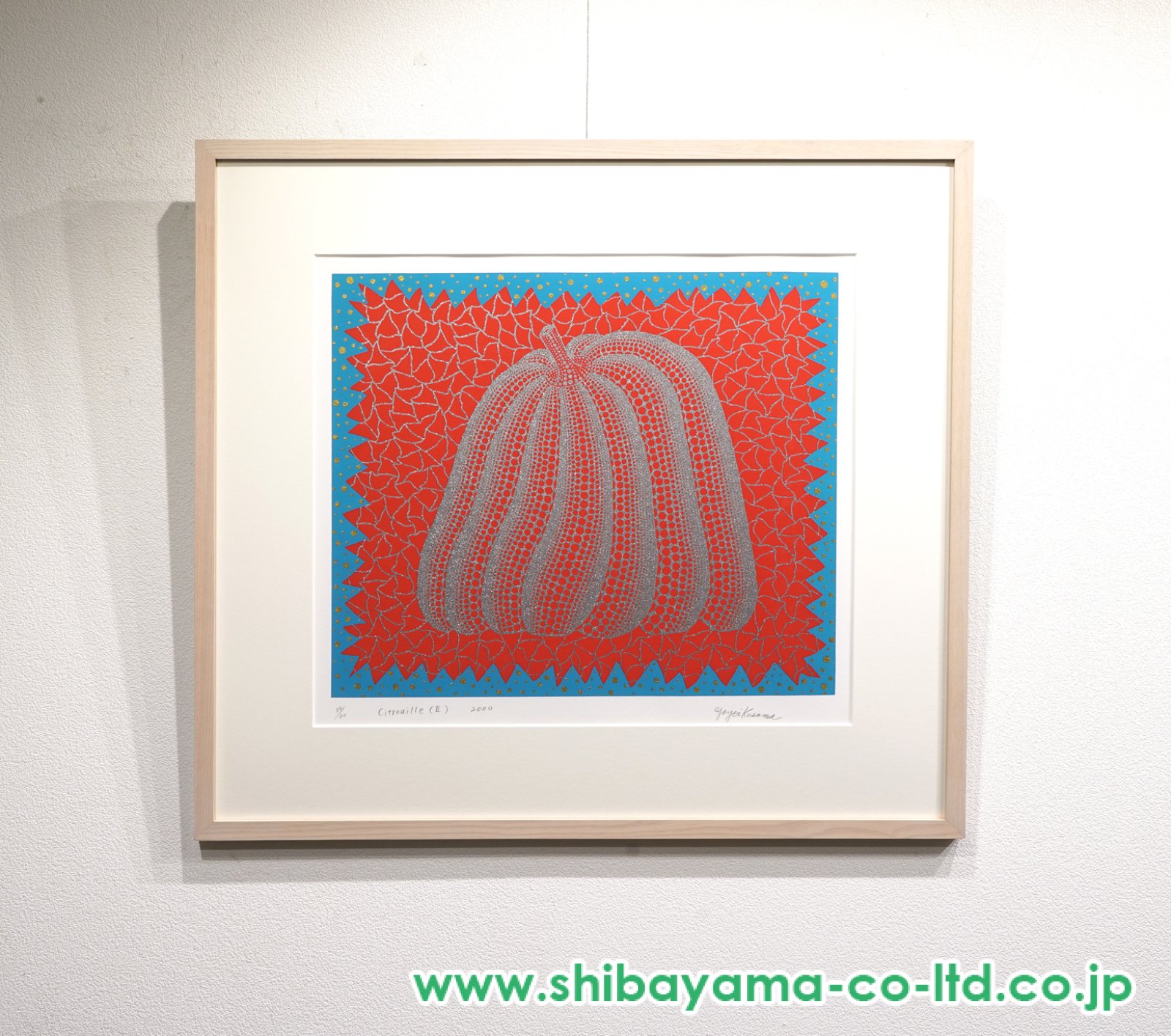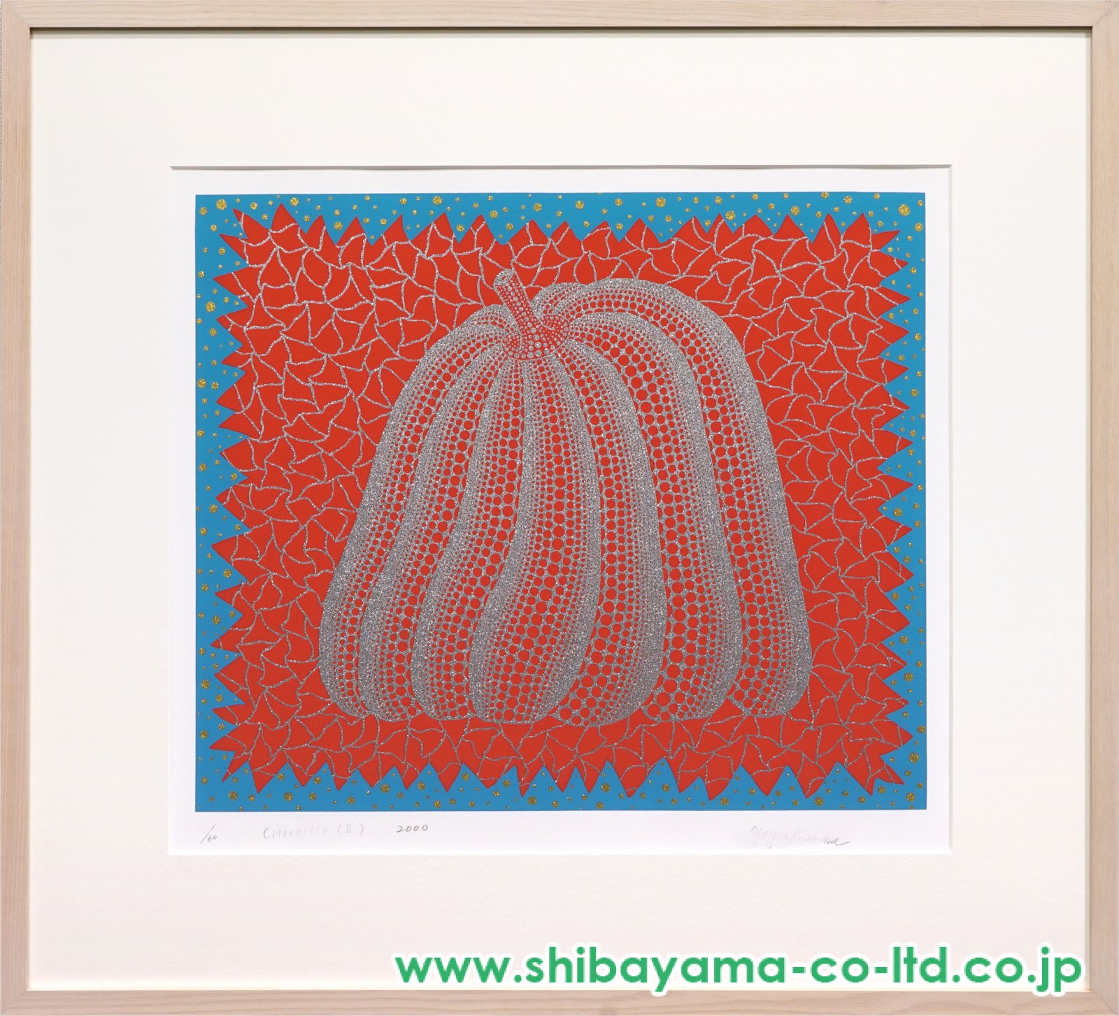 鮮烈な色彩とラメの輝き、そして水玉の反復による独特のリズムが融合した本作は、草間芸術を象徴するかぼちゃの魅力を華やかに表現したコレクション性の高い一作といえるでしょう。