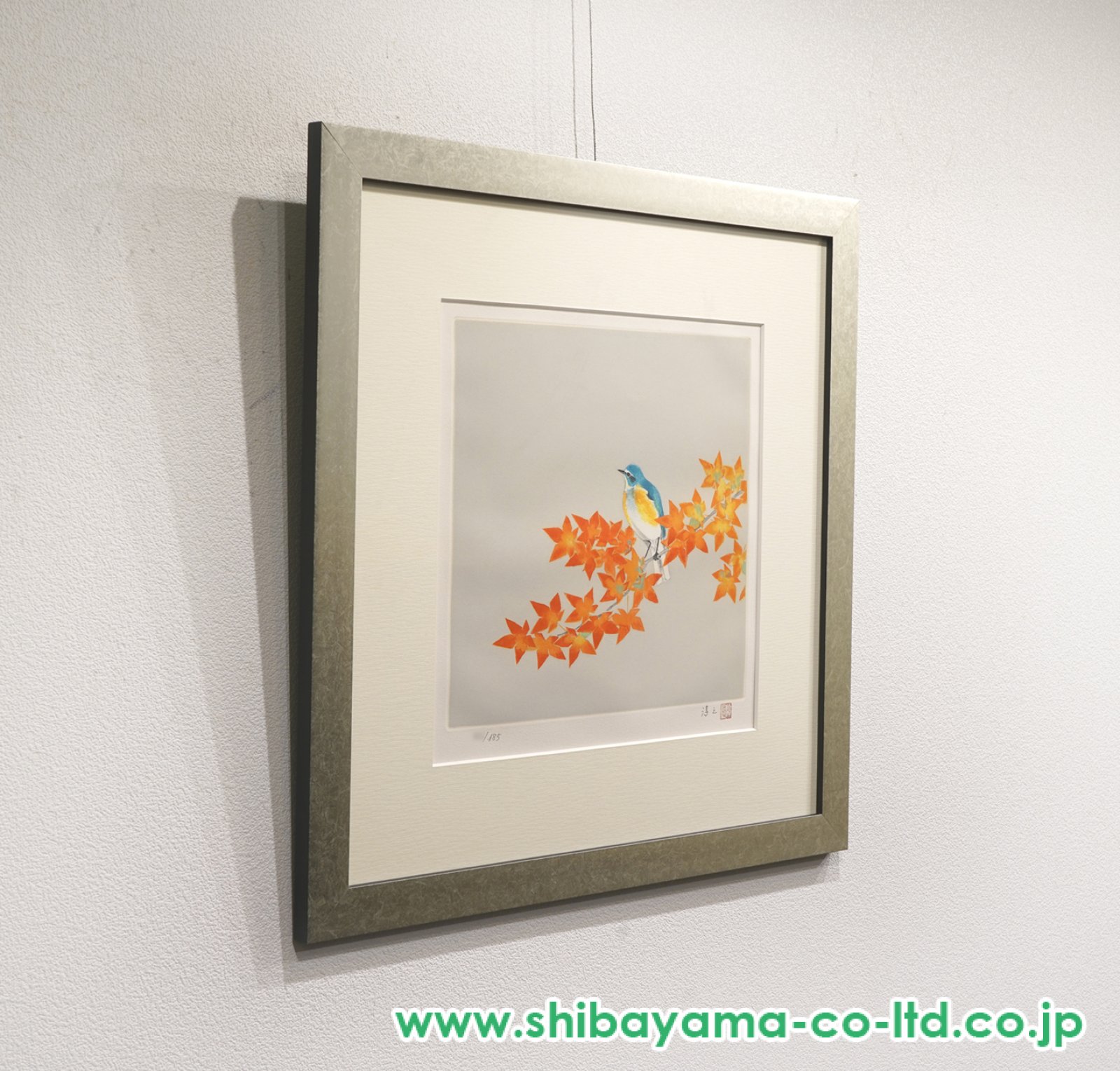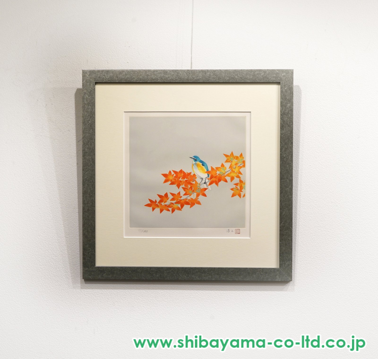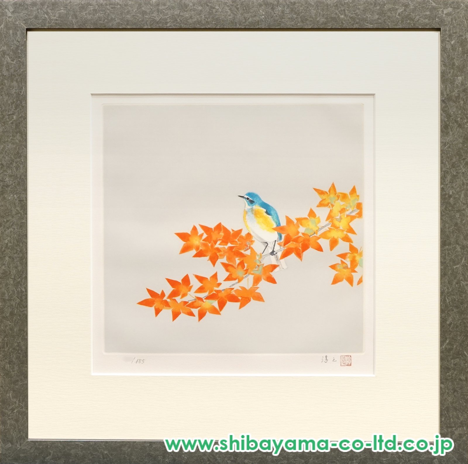 上村淳之《秋 るりびたき》は、澄んだ秋の気配を、簡潔で洗練された構成のなかに映し出した作品です。 淡い灰色の静かな背景のなか、鮮やかな橙色に色づいた紅葉の枝に、瑠璃色の羽をもつ瑠璃鶲がそっととまる姿が描かれています。 青と黄を帯びた鳥の小さな身体は繊細に描き分けられ、燃えるような秋色の葉との対比によって、季節の冴えた美しさがいっそう際立っています。 余白を大きく生かした画面構成は、鳥の愛らしさを際立たせると同時に、澄んだ空気や静かな時間の流れまでも感じさせ、上村淳之らしい気品と抒情を漂わせています。 秋の一瞬の美しさを、自然への深い観察と端正な美意識によって結晶させた、清らかで魅力的な作品です。