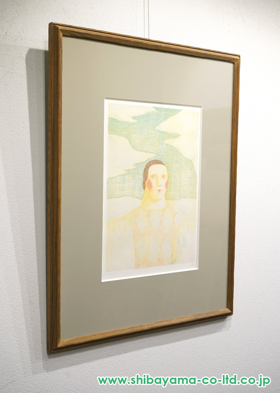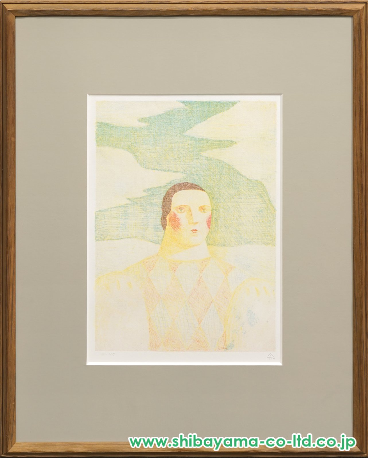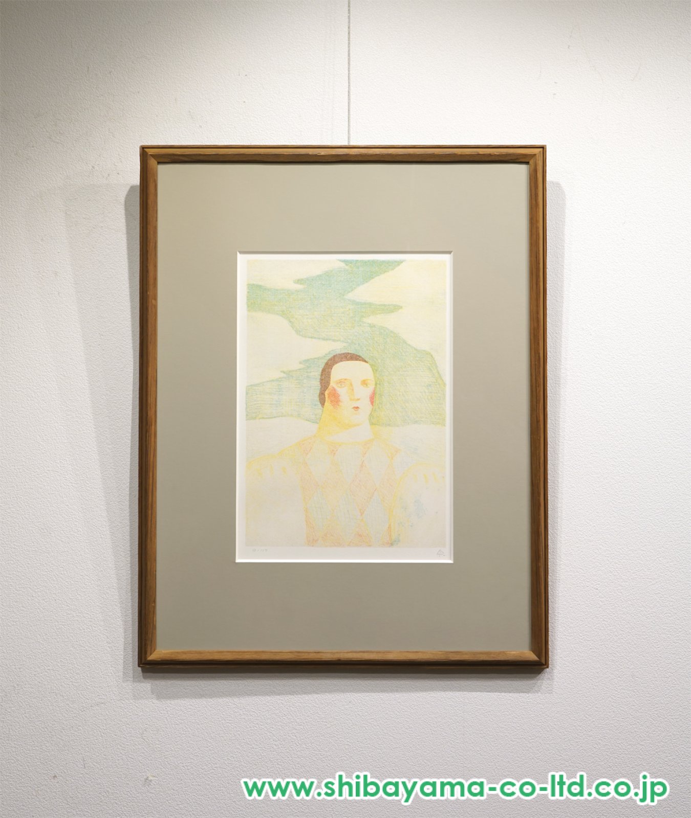 淡い色鉛筆調の線と柔らかな色面で、静かに佇む人物像を描いた「四季」シリーズの一点。背景に流れる風のようなフォルムと、頬を染めた穏やかな表情が呼応し、夏の気配を内側から感じさせる構成となっています。衣装の菱形文様は道化師(アルルカン)を思わせ、有元作品にしばしば見られる“夢と現実のあわい”を象徴的に表現しています。 有元利夫はテンペラ技法を基盤に、古典絵画への深い理解と詩的感性を融合させた独自の世界で知られる洋画家。本作のリトグラフでも、原画の静謐な空気感を大切にしながら、線の抑揚や色の重なりによって、見る者の記憶にそっと触れるような余韻を残します。